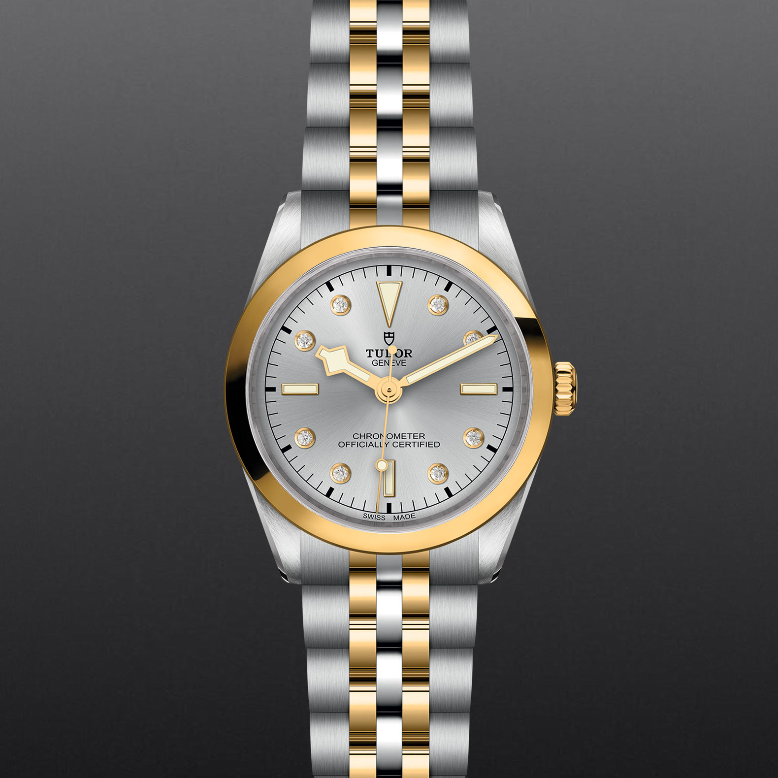 Screw-down winding crown with the TUDOR rose in relief. Steel covered by a 0.1mm 18 ct yellow gold cap