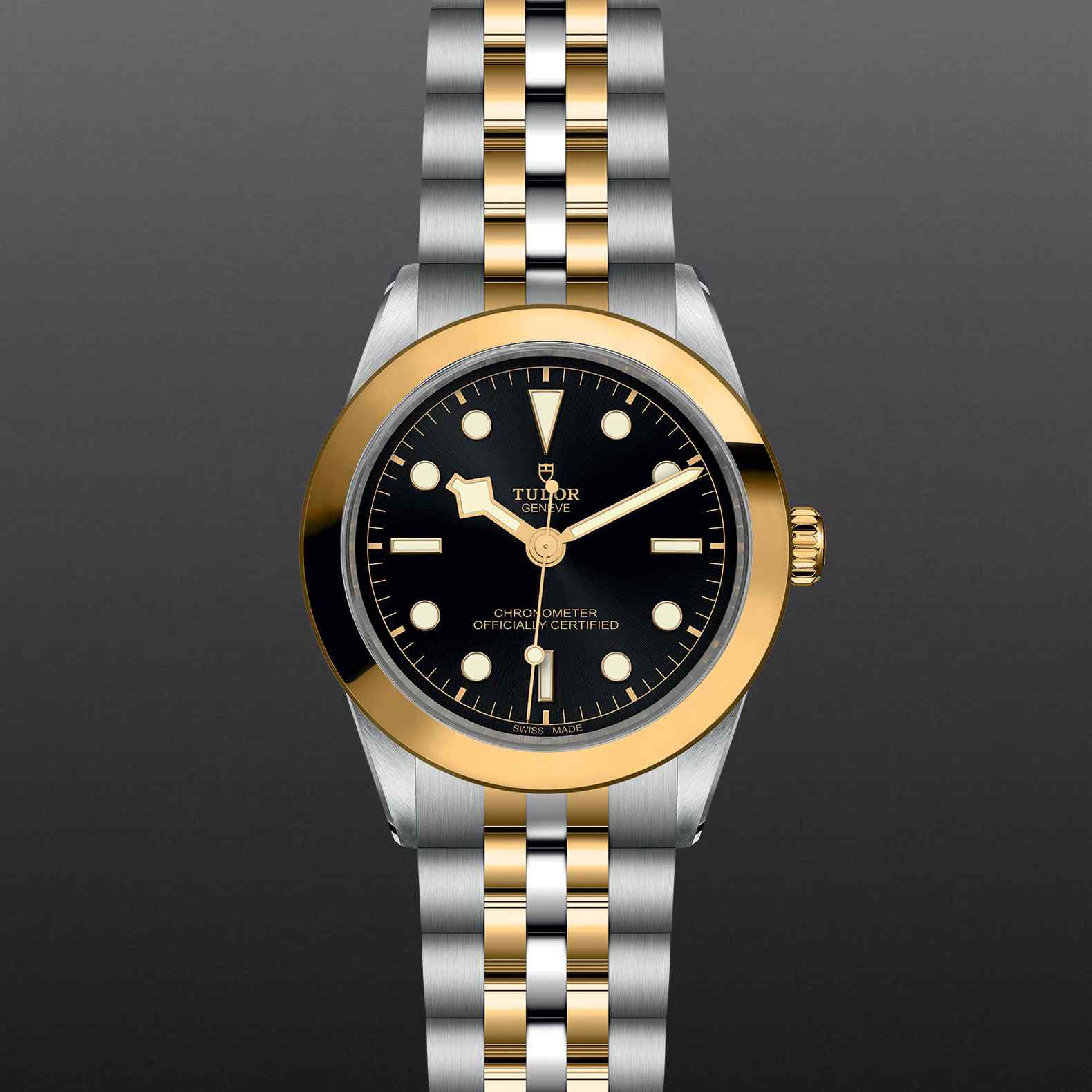 Screw-down winding crown with the TUDOR rose in relief. Steel covered by a 0.1mm 18 ct yellow gold cap