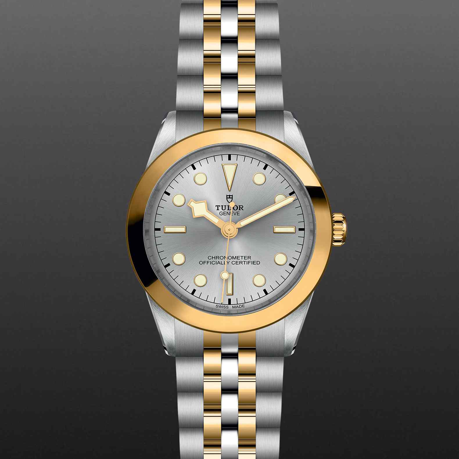 Screw-down winding crown with the TUDOR rose in relief. Steel covered by a 0.1mm 18 ct yellow gold cap