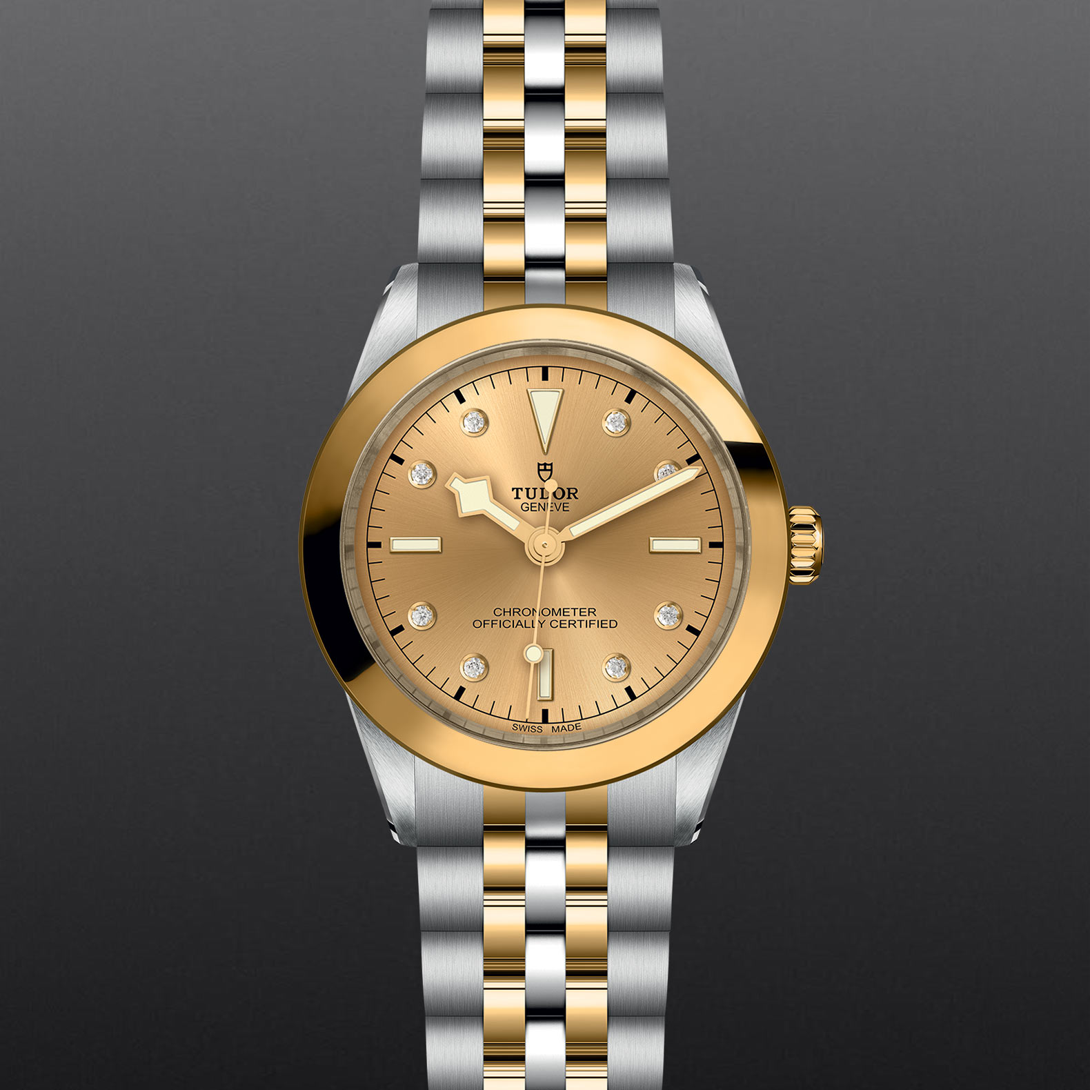 Screw-down winding crown with the TUDOR rose in relief. Steel covered by a 0.1mm 18 ct yellow gold cap