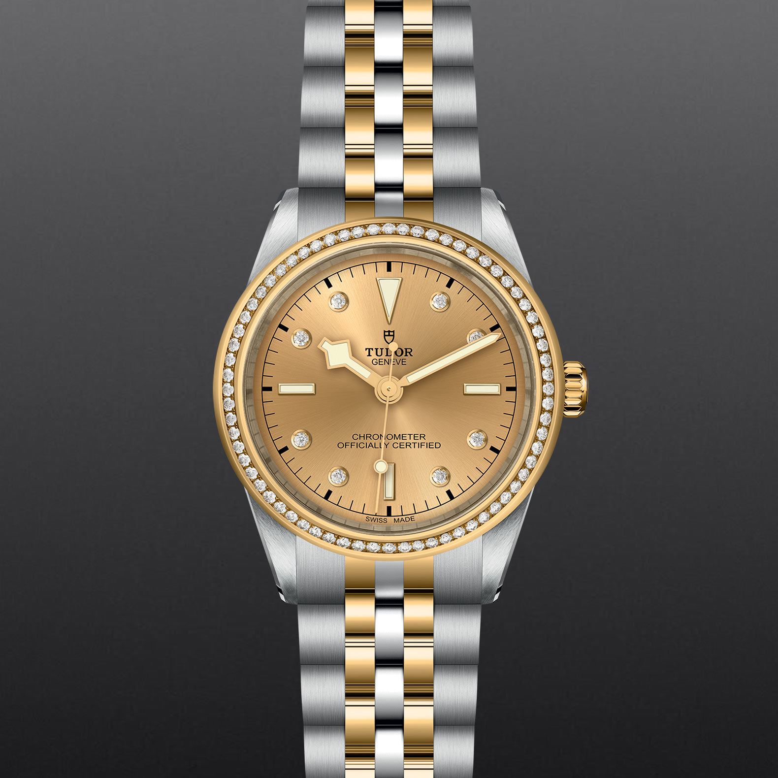 Screw-down winding crown with the TUDOR rose in relief. Steel covered by a 0.1mm 18 ct yellow gold cap