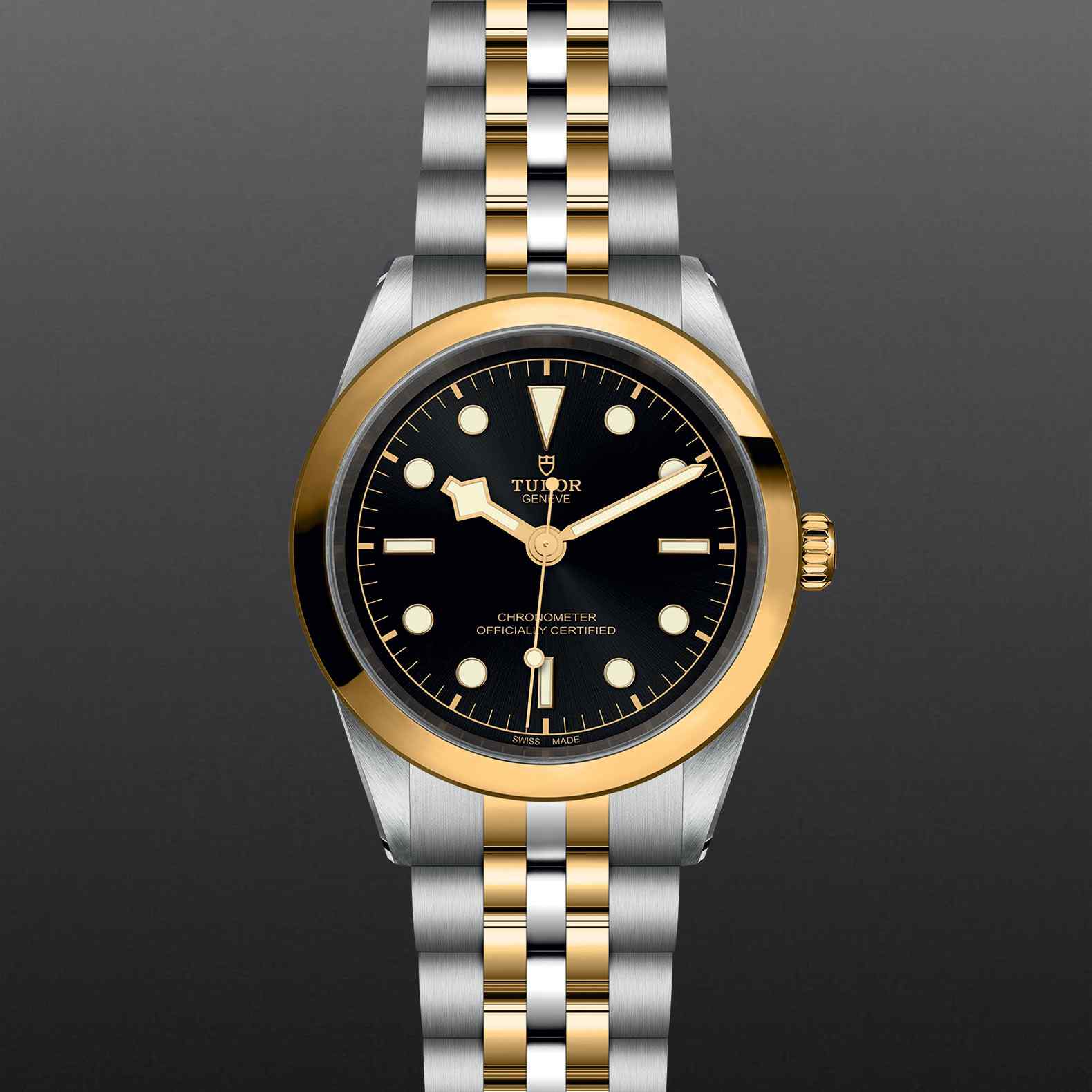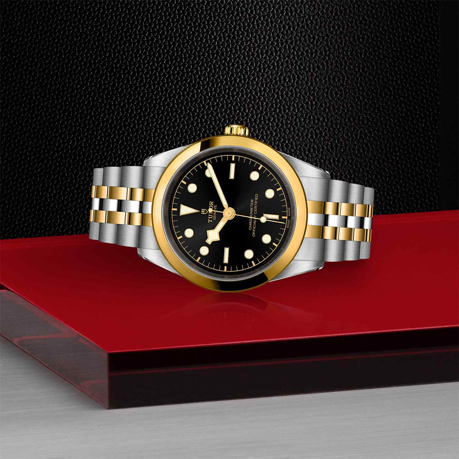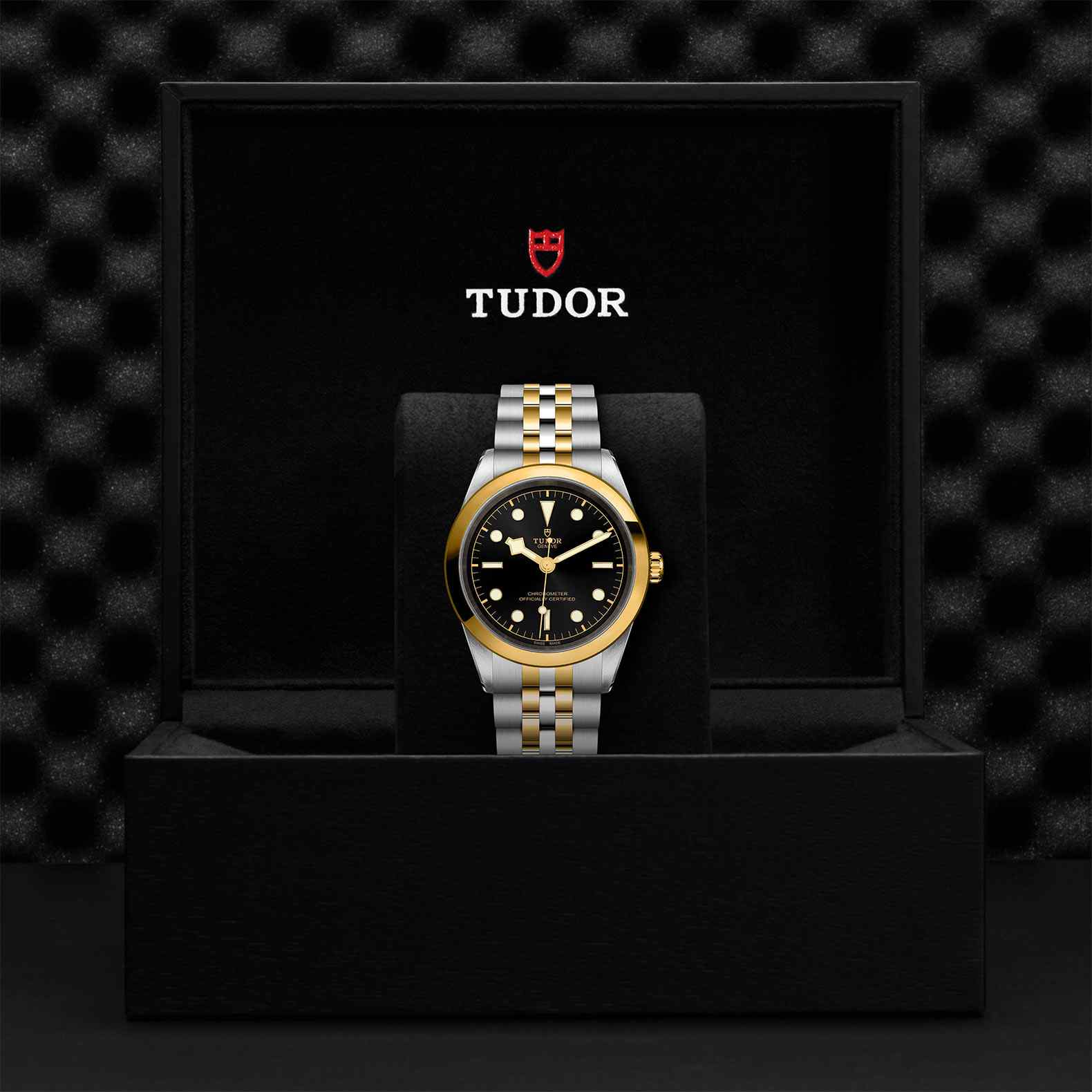 Enhancing the Black Bay with yellow gold creates a version named S&G, for Steel & Gold. Tudor derived the characteristic aesthetic elements of the Black Bay S&G model from its history. The overall shape, as well as the domed dial and crystal, come from the first Tudor divers’ watches. In this version the lines and proportions of the Black Bay are retained, while the rotating bezel and the winding crown are made from yellow gold.and crystal from the first Tudor diving watches. It borrows the characteristic angular hands, known as snowflake, from the watches delivered in large quantities to the French National Navy in the 1970s.