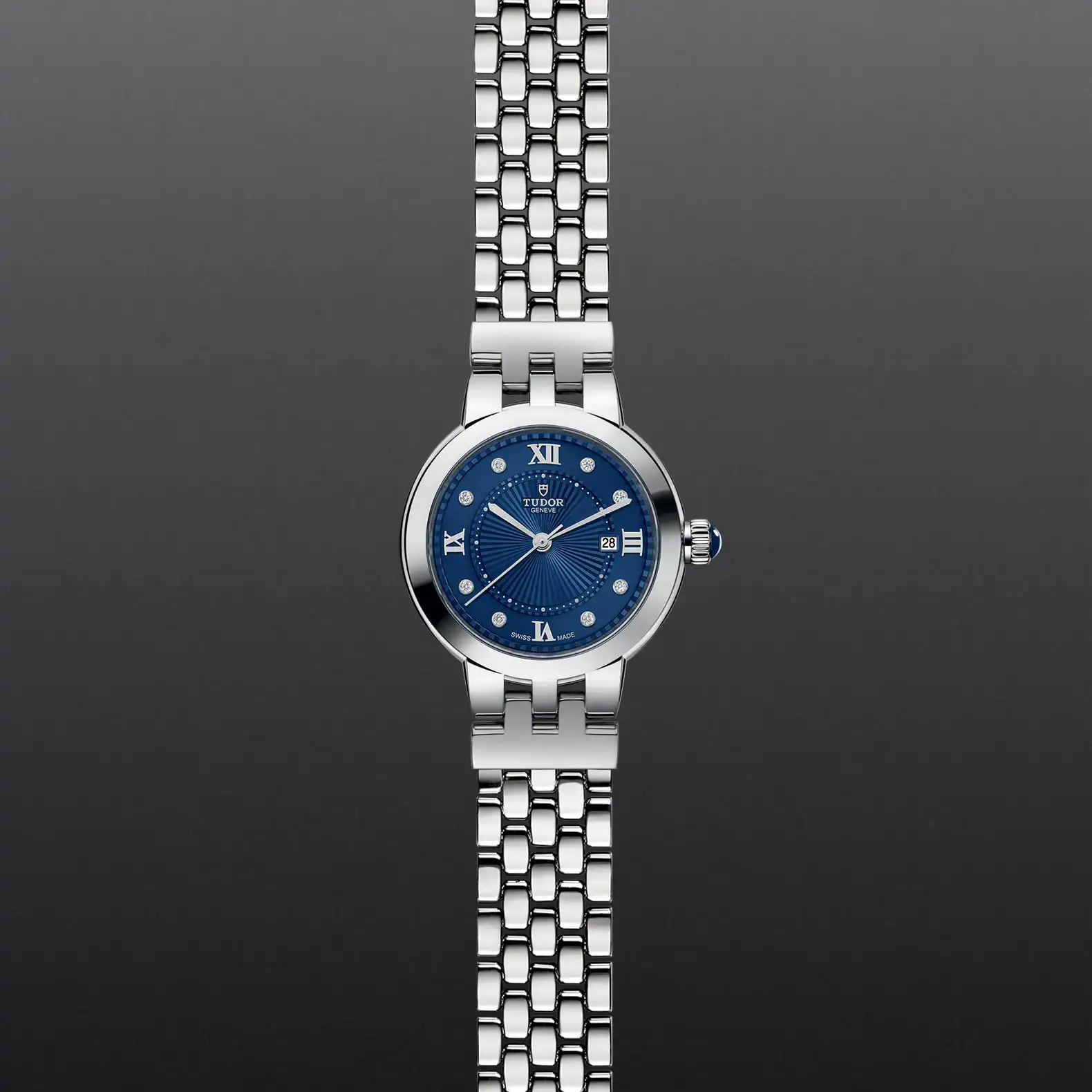 The Clair de Rose line, reimagined in a classic, refined and timeless spirit, uses the brand’s historic aesthetic codes. The Clair de Rose collection is available exclusively in steel and in six configurations and three sizes, 26, 30 and 34mm in diameter, it presents opaline dials with delicate decorations in relief, punctuated with blue lacquered Roman numerals or diamonds. This year, a new “TUDOR Blue” dial option is available for the Clair de Rose in all sizes.