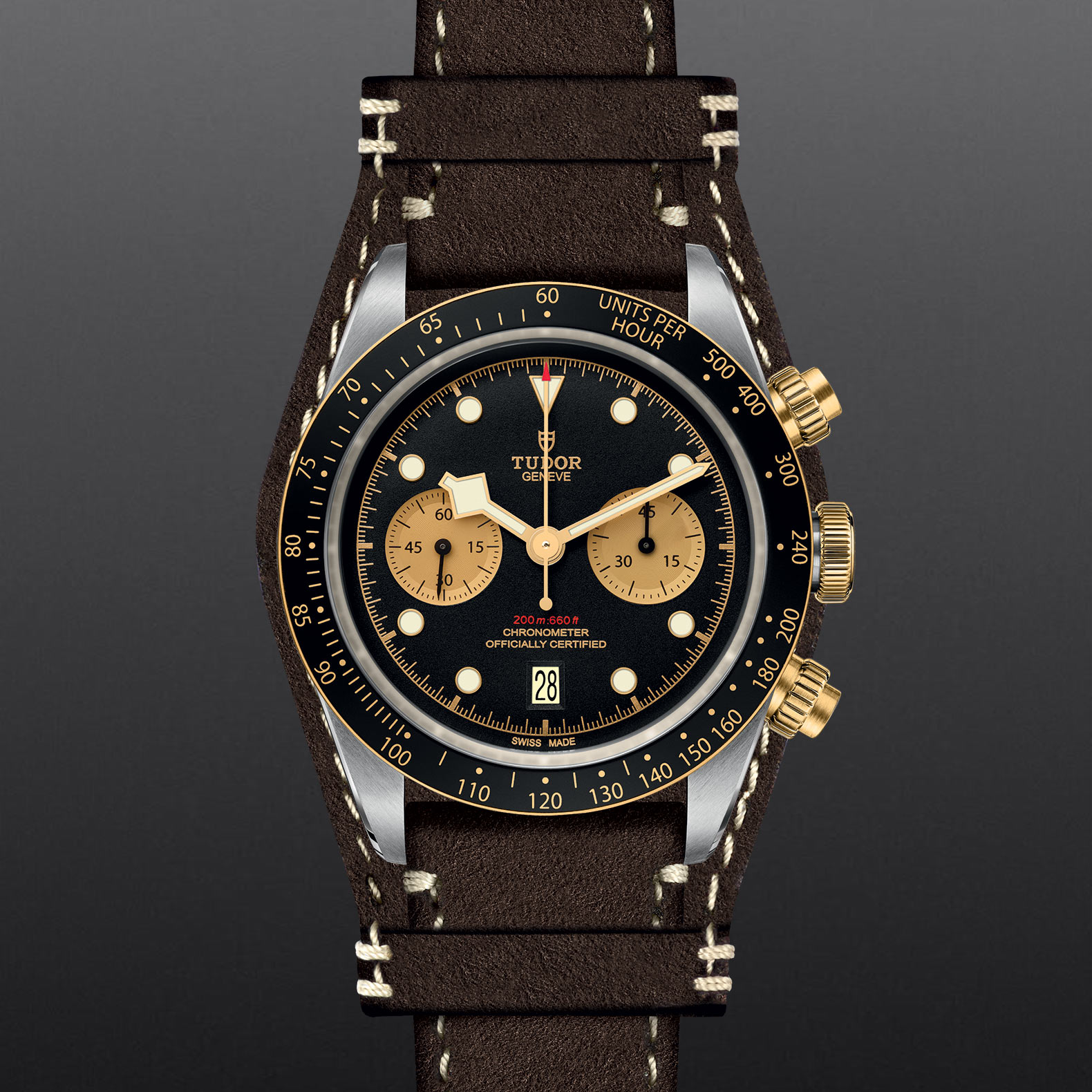 18K黄金固定外圈,配黑色阳极氧化铝测速计字圈,黄金刻度