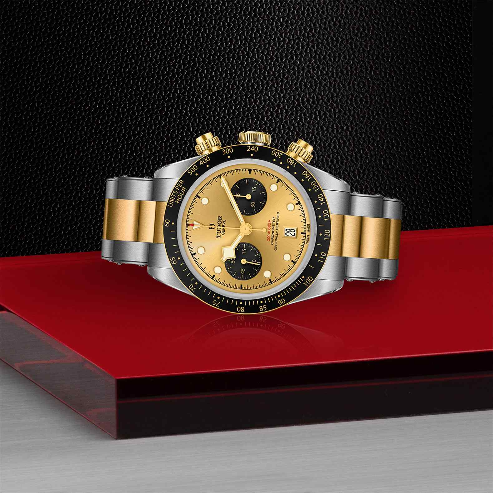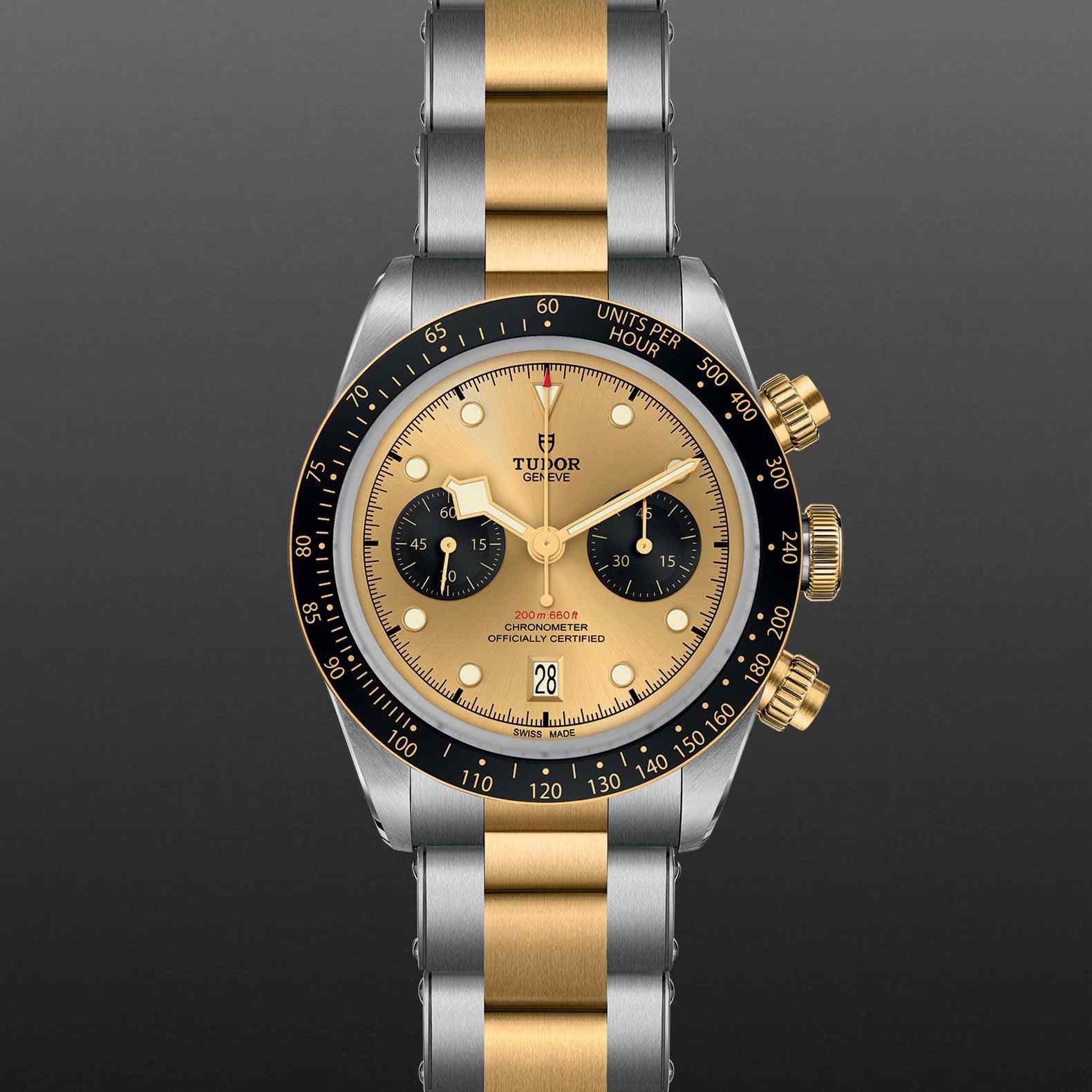 混合型Black Bay Chrono将Black Bay系列代表的潜水表传统与赛车计时表的精髓相结合。钢表壳保留了Black Bay系列的显著特征,其按钮的设计灵感则源于第一代帝舵计时腕表。圆纹磨砂钢固定外圈刻有测速计刻度,使这款运动型计时腕表的外观更趋完备。