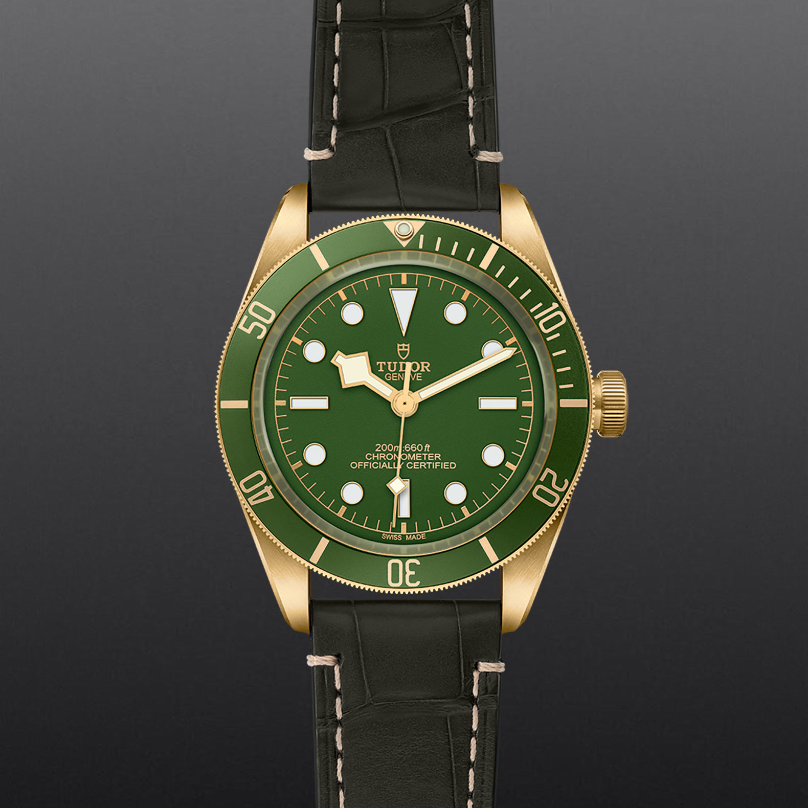 18K黄金单向旋转外圈,配哑绿色阳极氧化铝60分钟刻度字圈,镀金数字及刻度