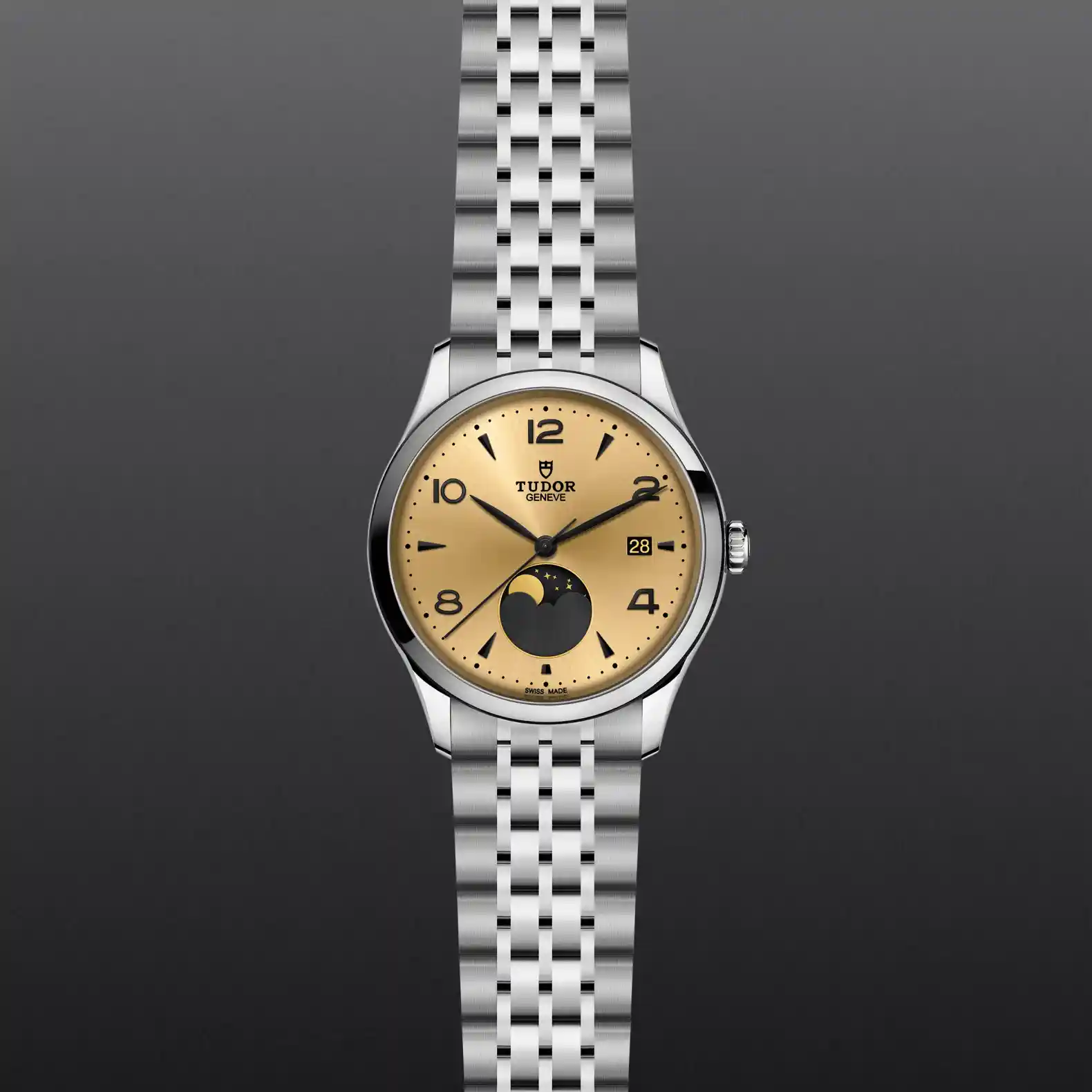 香檳色錶面,飾以太陽放射紋,配立體鐘點標記及月相指示