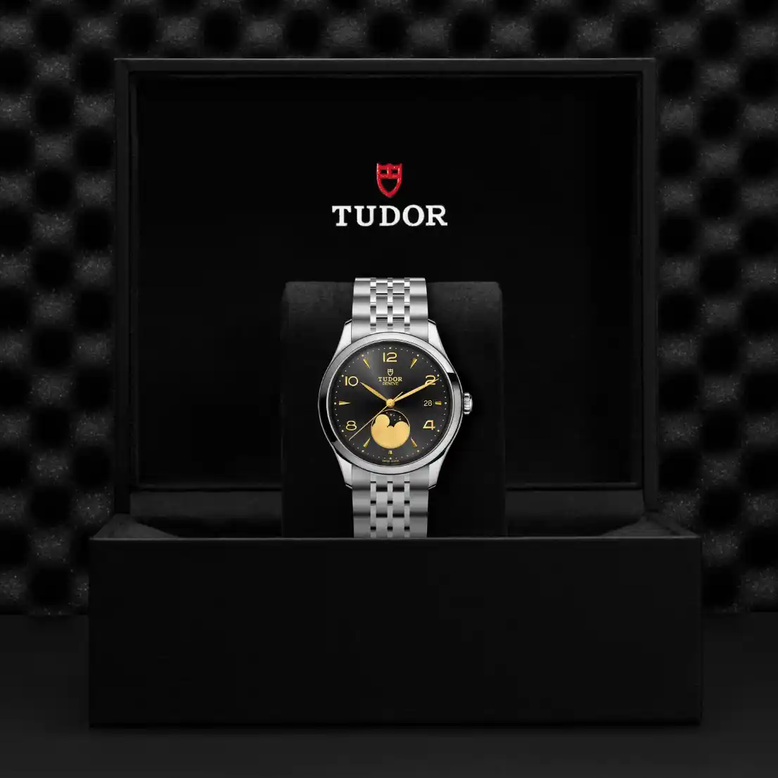 黑色錶面,飾以太陽放射紋,配立體鐘點標記及月相指示