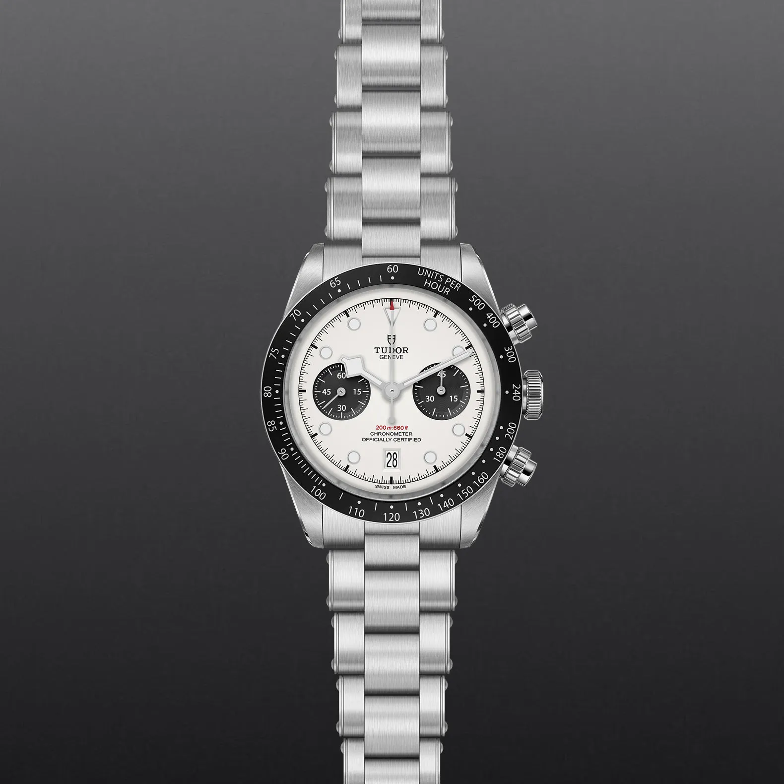 混合型Black Bay Chrono將Black Bay系列代表的潛水錶傳統與賽車計時錶的精髓相結合。鋼錶殼保留了Black Bay系列的顯著特徵,其按鈕的設計靈感則源於第一代帝舵計時腕錶。固定外圈設有測速計刻度,使這款運動型計時腕錶的外觀更趨完備。