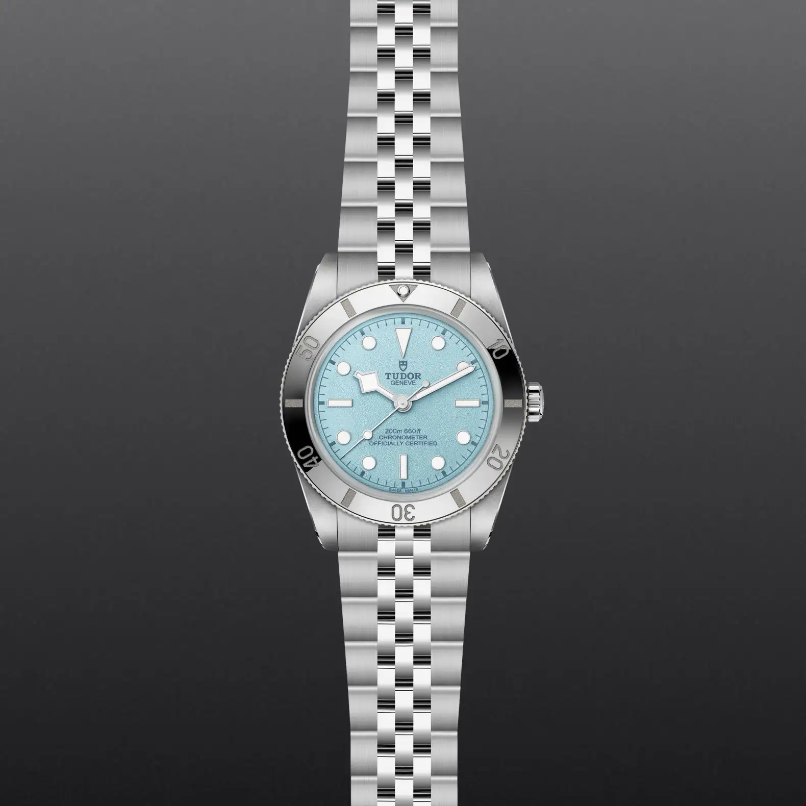 Black Bay 54近乎忠實地復刻了品牌首款潛水腕錶7922型。經典的37毫米錶殼延續了原始比例。但在復古的外觀下,它又以帝舵表原廠單一計時機芯MT5400型及200米的防水深度,彰顯了與時俱進的卓越技術實力。「湖水藍款」特別版啟發自熱帶碧海色彩,搭配沙質「湖水藍」錶面、五鏈節錶帶及鏡面磨光外圈。