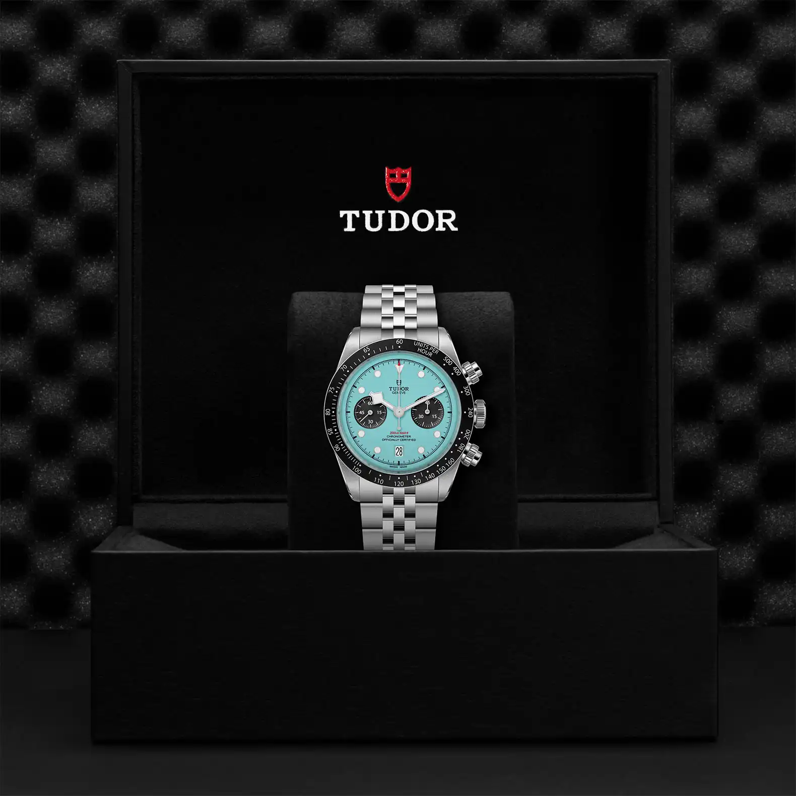 混合型Black Bay Chrono將Black Bay系列代表的潛水錶傳統與賽車計時錶的精髓相結合。鋼錶殼保留了Black Bay系列的顯著特徵,其按鈕的設計靈感則源於第一代帝舵計時腕錶。固定外圈設有測速計刻度,使這款運動型計時腕錶的外觀更趨完備。